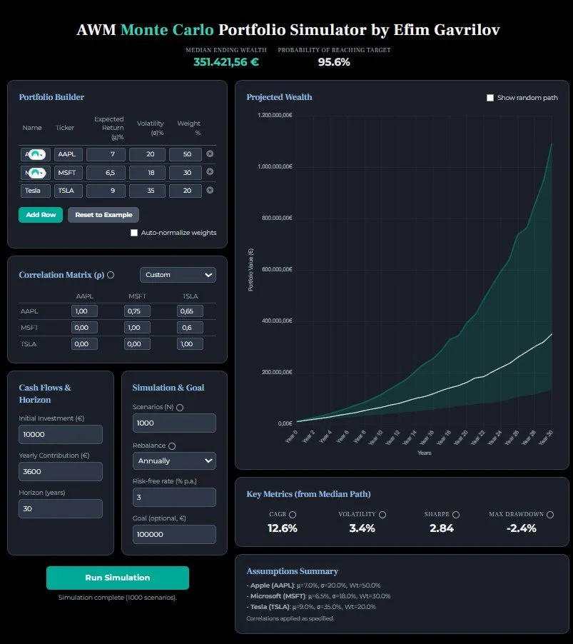 This section presents my perspective on Quantitative & Asset Management through two portfolio simulation projects — the Monte Carlo Portfolio Simulator and the Stock Simulator. Together, they demonstrate the ability to model uncertainty, analyze allocation strategies, and evaluate risk–return profiles across thousands of scenarios. These deliverables highlight the skills required to design robust frameworks, interpret probabilistic outcomes, and translate quantitative models into practical investment insights for decision-making.