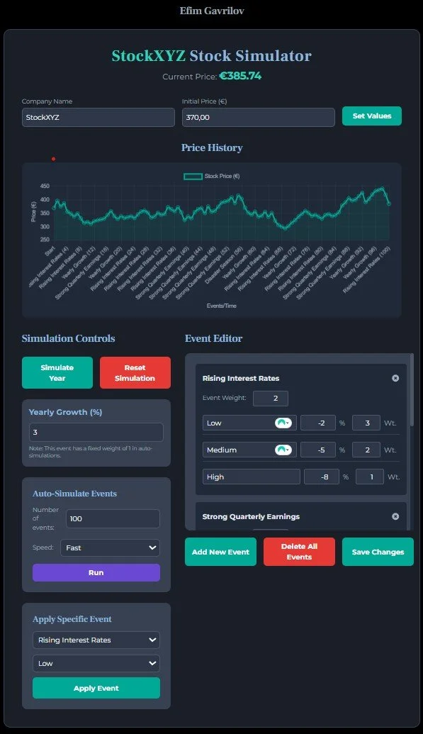 A concise profile of the Stock Simulator, a deterministic, event-based tool that models how individual stock prices evolve under specific scenarios. It uses an event system (e.g., earnings beats, product launches, regulatory actions) with weighted outcomes to show how news impacts valuation. Key outputs include price history charts, event impact analysis, and scenario comparisons — making it an accessible framework for teaching, equity research, and “what-if” analysis of market events.