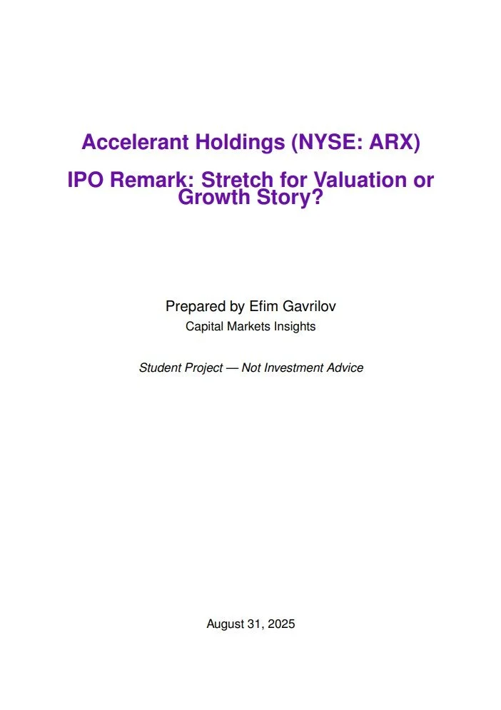This project delivers a concise but comprehensive IPO remark on Accelerant Holdings (NYSE: ARX), highlighting its data-driven specialty insurance platform, rapid growth (+68% YoY revenue in Q2 2025), and strong debut performance (+26.2% above IPO price). The analysis reviews the $723m offering, $6.4bn launch valuation, and rich P/S multiple of 10.6x versus peer average 2.9x, underscoring both investor enthusiasm and execution risk. The report is structured across key sections—deal overview, company snapshot, financials, market reaction, comparables, hazards, and strategic perspective—providing a clear assessment of valuation stretch versus growth story.