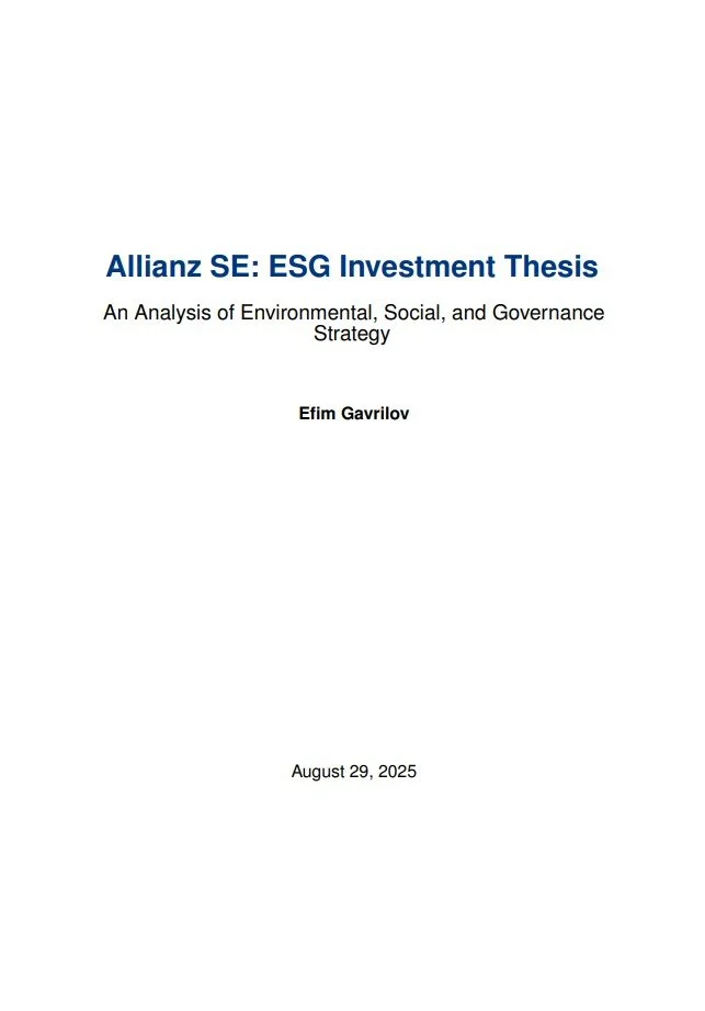 This project delivers a concise but comprehensive ESG profile of Allianz SE, highlighting its leadership in sustainability with €171.9bn sustainable AUM, a 50.7% reduction in portfolio emissions since 2019, and top-tier governance practices. Allianz scores A overall (E=A, S=A-, G=A+), supported by product innovation (Green2Green), strong social reach, and benchmark stewardship standards. The report is structured across key sections—investment thesis, pillar grades, catalysts & KPIs, risks, and references—providing a clear ESG assessment and long-term sustainability case.