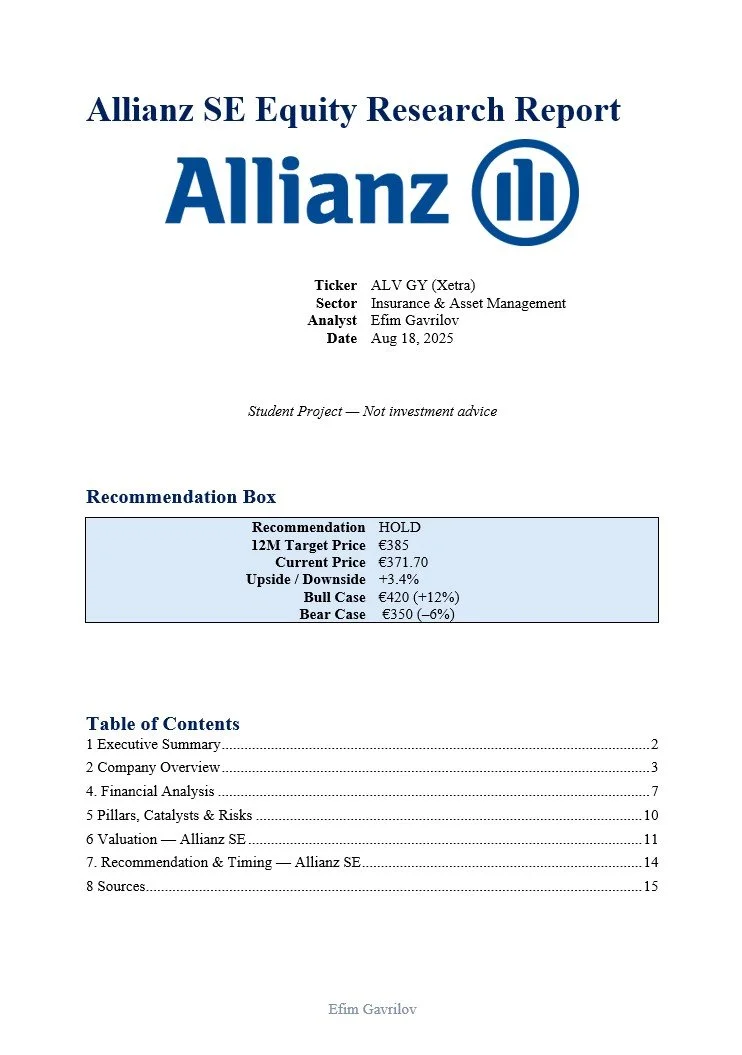 This project delivers a concise but comprehensive profile of Allianz SE, highlighting its scale as a global leader with €1.9 trillion assets under management, €179.8 billion in revenues, and operations across nearly 70 countries. Key financial and industry metrics include the combined ratio, solvency capital ratio, and a sustainable dividend yield of around 4–5 percent, supported by a diversified business mix across Property & Casualty, Life/Health, and Asset Management. The equity research report is structured across eight sections—executive summary, company overview, industry landscape, financial analysis, pillars and risks, valuation, recommendation & timing, and sources—providing a clear business profile, financial assessment, and investment recommendation.