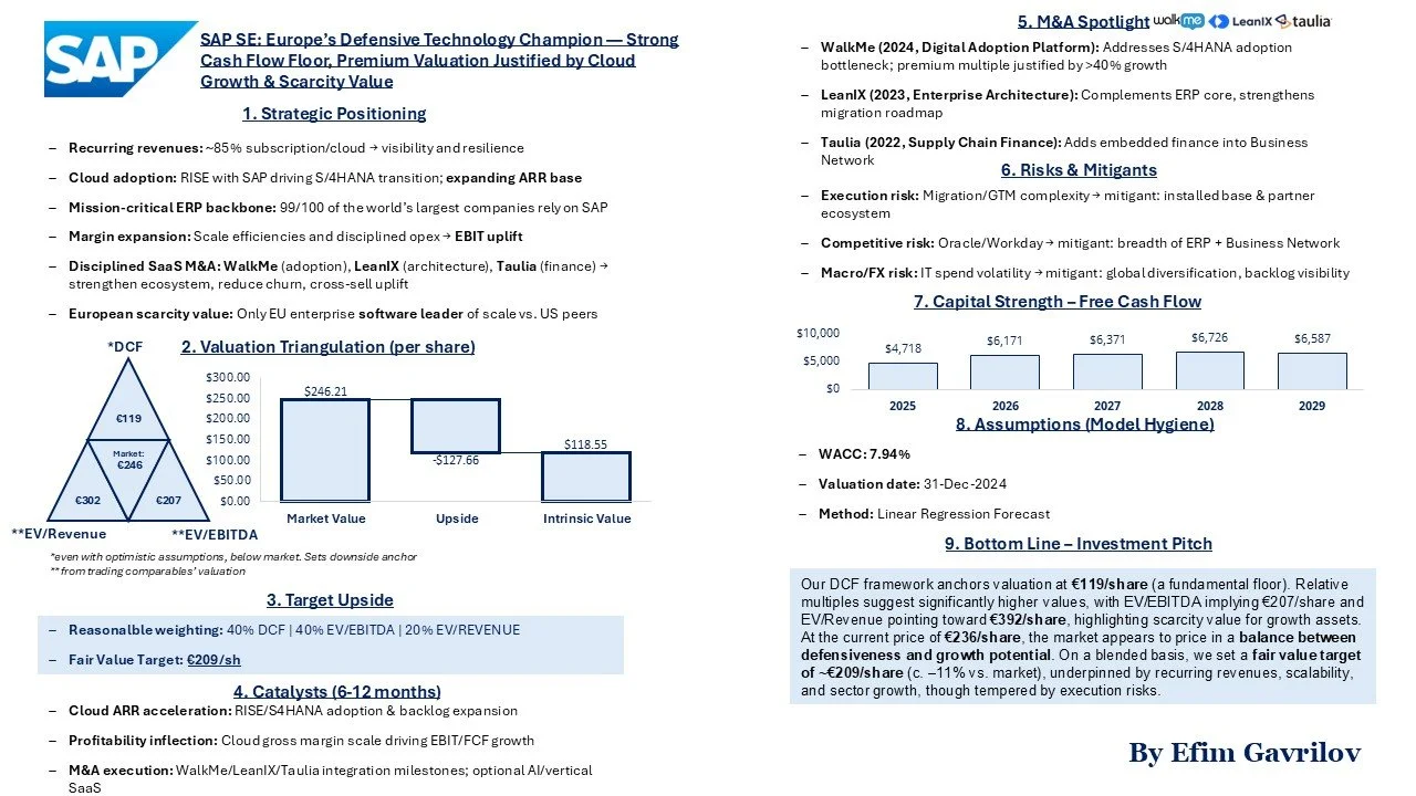 A final synthesis that consolidates insights from the overview, DCF model, comparables and M&A commentary into one coherent equity story. The conclusion frames SAP as a defensive European technology champion, supported by cloud adoption, margin expansion, and a high share of recurring revenues.