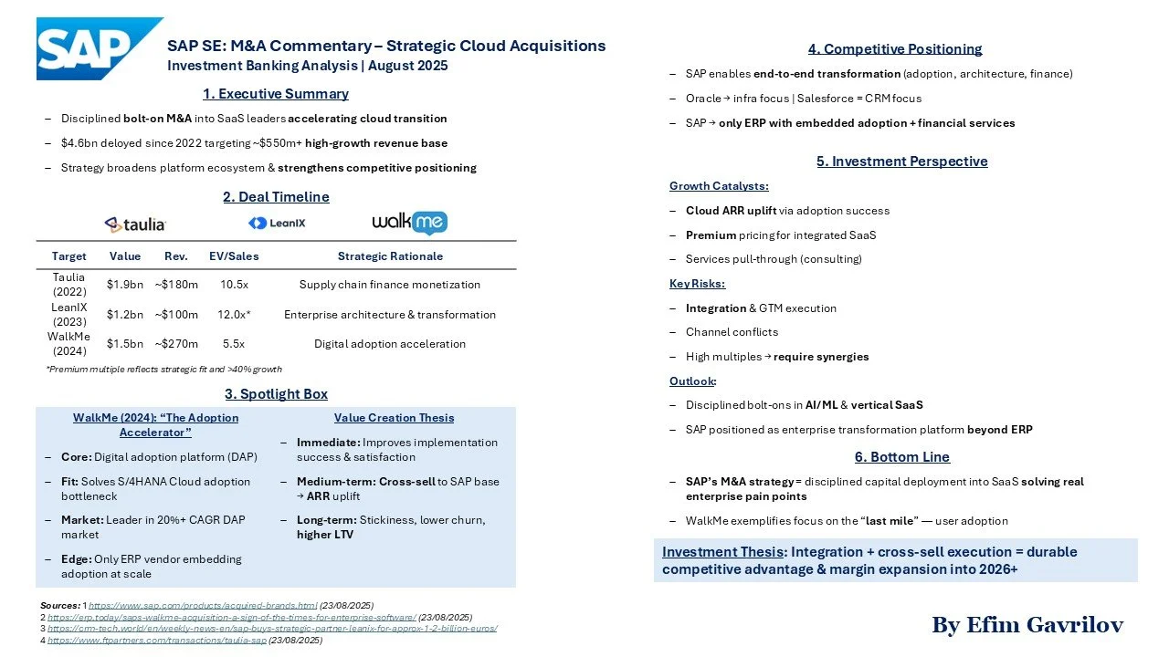 A focused commentary on SAP’s recent acquisitions, including WalkMe (2024), LeanIX (2023), and Taulia (2022). Each deal is reviewed for deal value, financial data, and strategic fit, with emphasis on how they support SAP’s cloud transition.