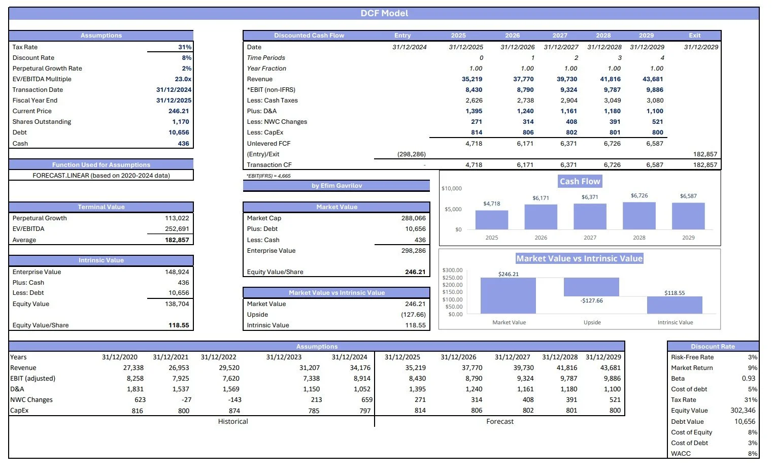 A 5-year forecast model of revenue, EBIT, and unlevered Free Cash Flow (FCF), combined with a WACC calculation based on CAPM and a terminal value using the Gordon Growth method.