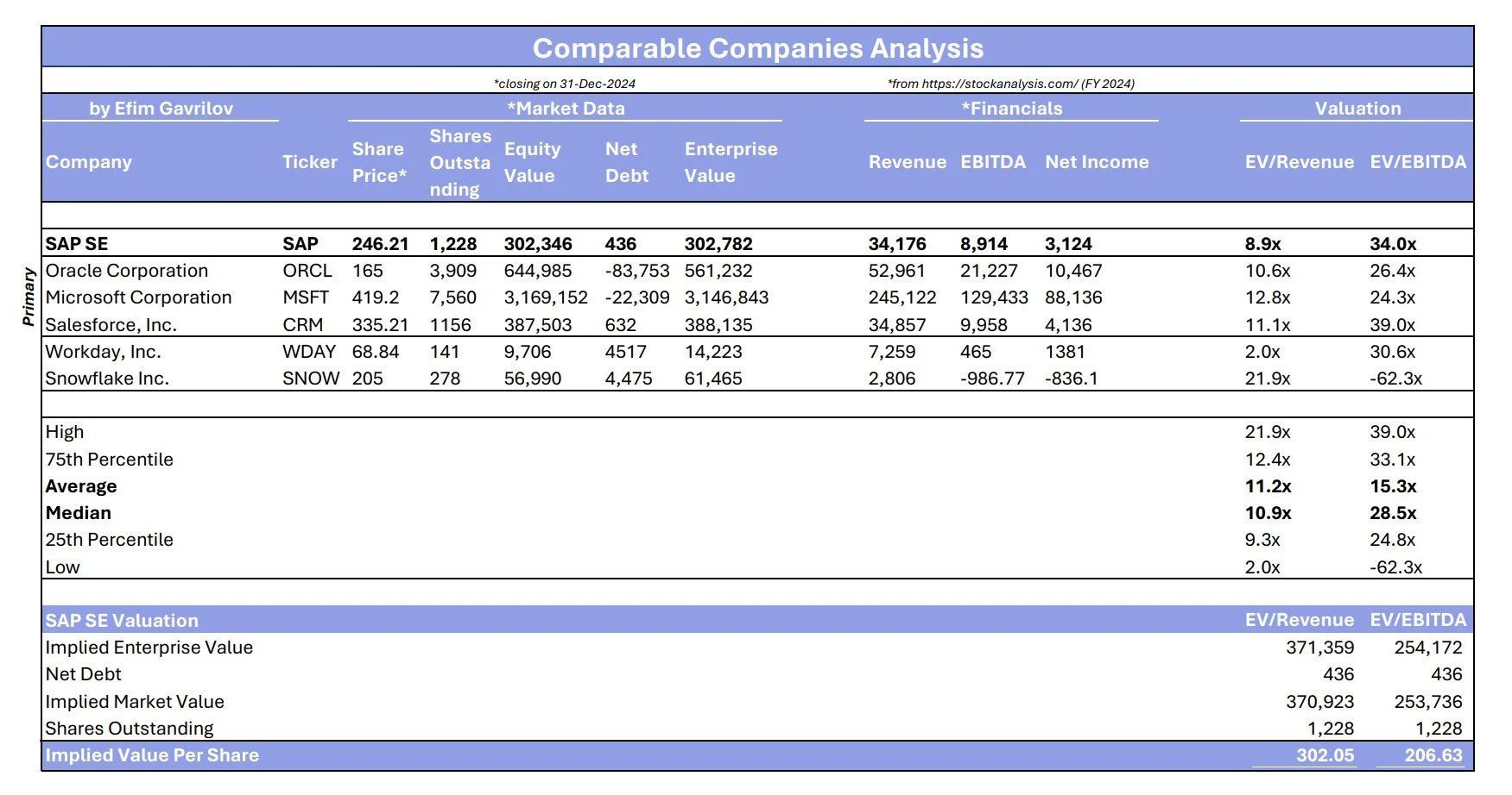 A peer benchmarking exercise against Oracle, Microsoft, Salesforce, Workday, and Snowflake, using EV/EBITDA as well as EV/Revenue as multiples. The analysis shows where SAP stands relative to global software leaders in terms of valuation positioning.